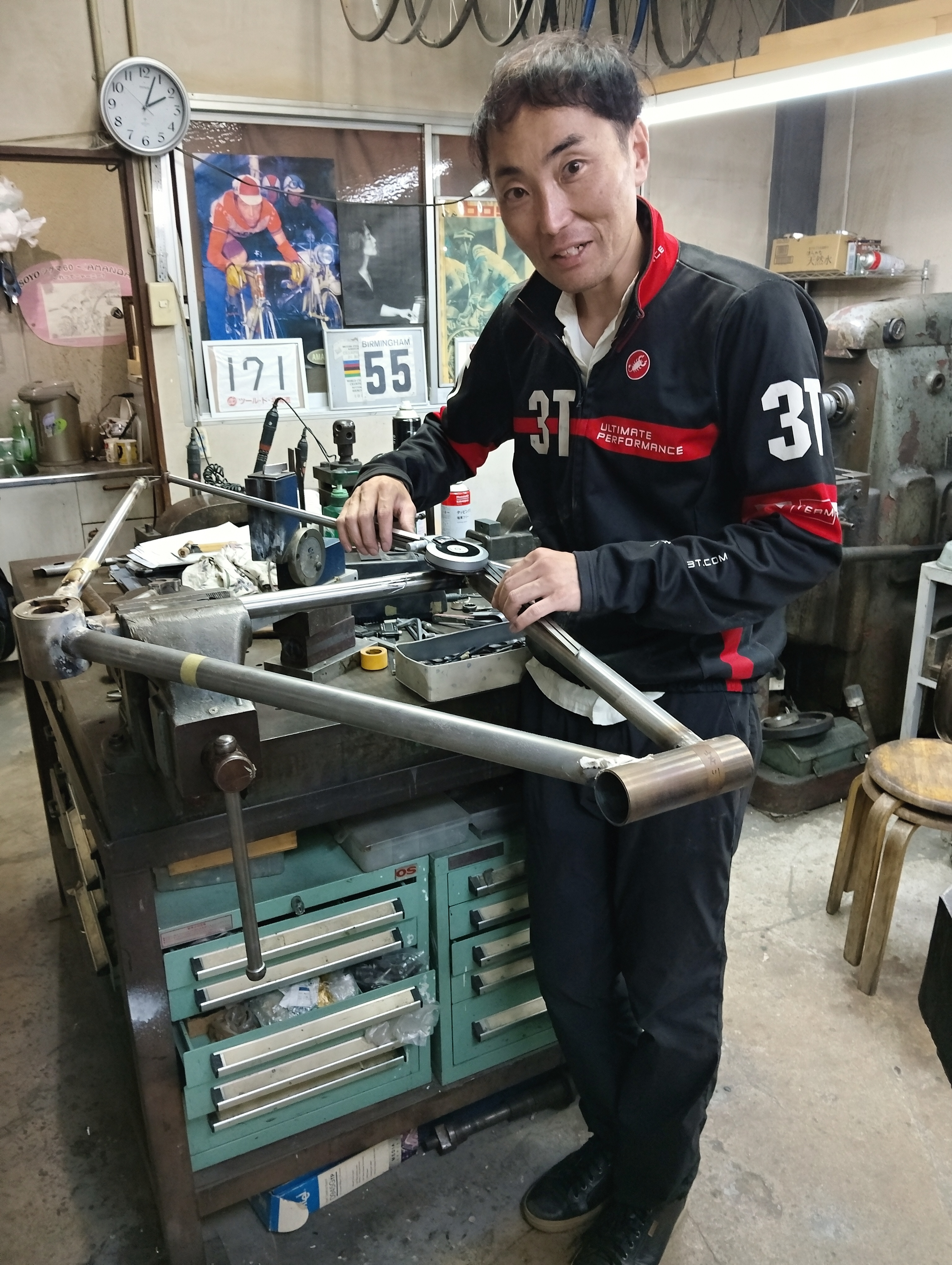 Q自作のきっかけは? ――雑誌を見て、ミニラボのことを知り、自分に特化した自転車欲しくなったんです。ただ、家内の承認がなかなか得られない。そこで作戦を立て、まず17歳の息子を「モノづくり教育」の一環としてミニラボに送り込みました。これは家内も賛成です。なにせ教育ですから。